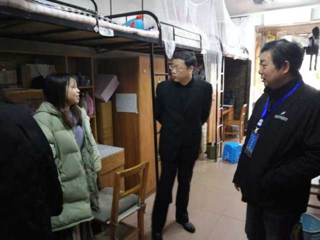 走访中,校领导一行走进了西一女生宿舍,看望同学们,并查看学生宿舍的环境。校长胡仲军叮嘱同学们要调整好学习状态,尽快投入学习。同时,校领导还带领职能部门对宿舍的安全用水、用电及防盗等方面进行了现场检查,表示学校将尽最大力量改善宿舍条件,为同学们提供一个安全舒适的宿舍环境。