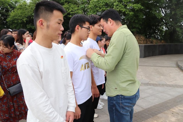 下午三时,同志们从大厅出发,步行约1.5公里,迈上235个台阶,前往烈士碑。在烈士碑下,全体成员在陈婧老师的带领下集体重温入党誓词,并由陈婧、陈群老师给党员们佩戴党徽。