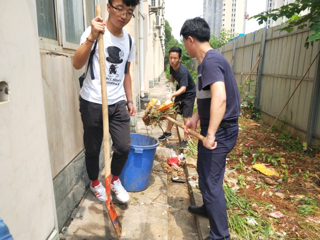 最后,由陈慧敏带队,带领全体辅导员和94名入党积极分子到西一和西六宿舍。在老师的带领下,分组有序地对宿舍四周进行卫生大清扫。同学们分工合作,顶着烈日劳动,无私奉献,圆满地完成了此次的洁净校园活动。