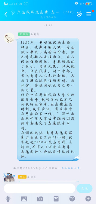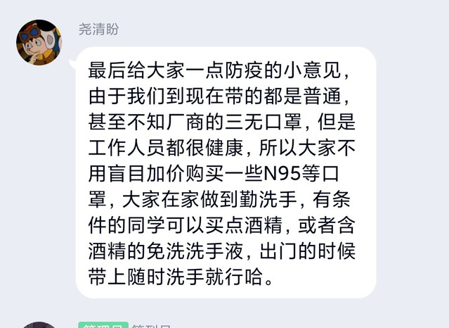 两位志愿者分享结束后,18级软件工程2班的匡豹同学表示:生活中有许多志愿者们的缩影,他们能够在所有人逃离的时候坚定的逆行,他们能够坐上离开家乡的列车奔赴新的战斗阵地,他们能够以耐心和包容面对疫情的种种困难……正是因为这一批批甘于奉献的人们,我们才能安心的在家等候春暖花开的到来。