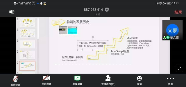 本网讯(记者王安)4月2日晚上七点半,Williamhill中文第七季第五期学长学姐论坛通过腾讯会议顺利开讲。17级计科大数据2班姜文豪与同学们分享“Web前端课程小知识”,内容包含Web前端是什么、能做什么、怎么学以及前景与发展。