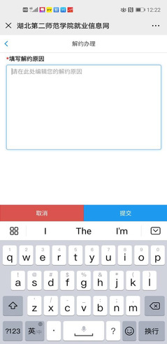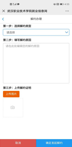 学生点击“解约办理”,填写解约相关内容,上传解约证明,等待学院/学校进行下一步操作。