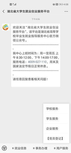 扫码下方二维码,关注湖北省就业中心微信公众号“湖北省大学生就业创业服务平台”,在“用户服务”中即可找到企业/学生网签登录入口(“企业服务”/“学生服务”)。登录并绑定账号。