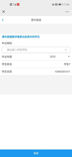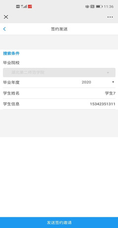 企业登录手机端后,在签约发起中,先将拟签约学生搜索出来,然后点击“发送签约邀请”,在邀请函中,填写邀请详细信息。确认无误后,点击“发送邀请”。(“签约发起”——“搜索”——“发送签约邀请”——““确认”)