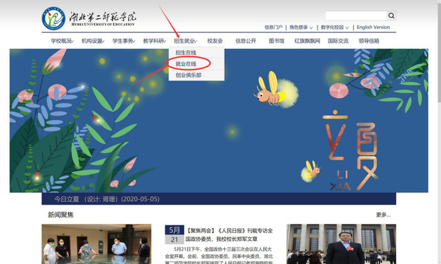 第一步:进入william威廉英国官网:www.hue.edu.cn,点击最上方招生就业栏目,选择就业在线