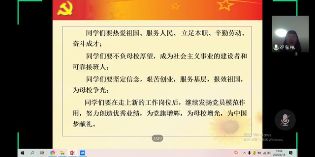 本网讯(记者 冯小庆 余慧君)6月18日下午,Williamhill中文学生第一党支部组织进行了“弘扬新时代爱国主义”的主题党课,重点针对毕业生党员谈进入社会后党员的责任担当和理想信念。主题党课以网络会议的形式召开,学生党支部书记邓家桃主讲,2020届毕业生党员参与此次会议。