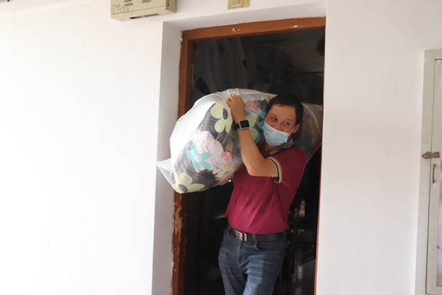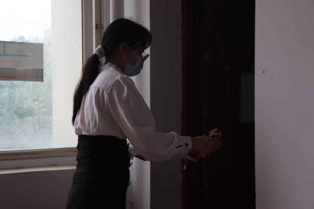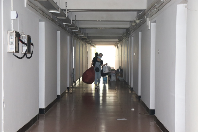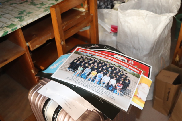 毕业生高帅把自己的床桌打扫的干干净净,垃圾都收拾好带走,离开时跟父亲在自己的书桌前留影
