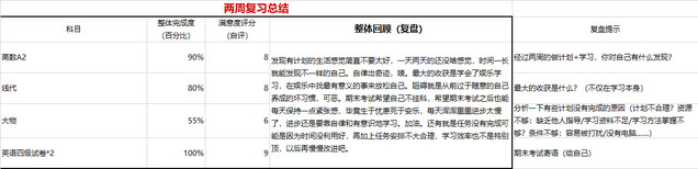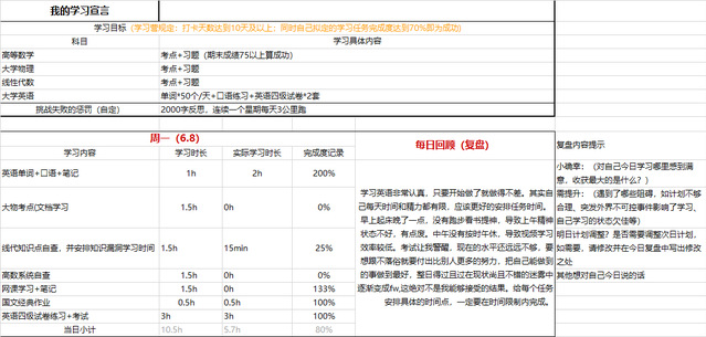 为学习营专门设计制作的计划表,包含两周总计划、每日计划学习记录复盘。