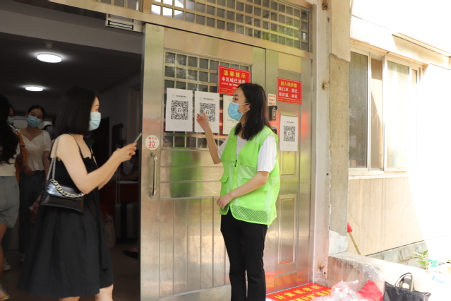 院学生会主席杨慧兰也是一名志愿者,她从早上开始一直到下午一点,已经来回从学校南门到西区学生公寓来回跑了五趟,帮助了五个返校后没能及时联系到班级互助小组的同学拿行李、到宿舍登记。当有同学来到寝室楼下时,志愿队的队员们马上接过箱子,带着微笑,引导学生进行进入寝室前的必要操作,扫码签到、出示健康码,填写资料等等,还有不少志愿者上楼帮助同学们晒被子,脸颊上的汗水清晰可见。