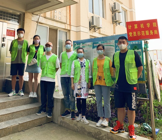 学院志愿服务队的老师和同学们在宿舍楼前岗位合照
