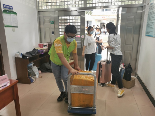 班级已经返校的同学正在帮助后来返校同学搬运行李