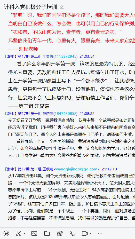 通过此次观看《开学第一课》,同学们感慨万千,各自在群内发表百字感想并互相交流,对青年党员工作任务有了更深刻的认识,进一步统一思想、端正态度并提高了责任感与使命感。