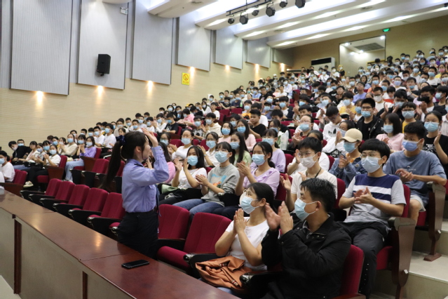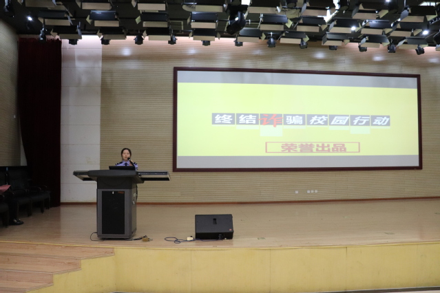 王警官重点讲解了近期常见的电信诈骗类型,展示了触目惊心的警情数量和受骗金额,提醒全体新生不能掉以轻心。王警官分别介绍了网络刷单、套路贷、网购类和冒充公检法四种常见骗术,结合真实案例,讲解骗子层出不穷的诈骗手段。