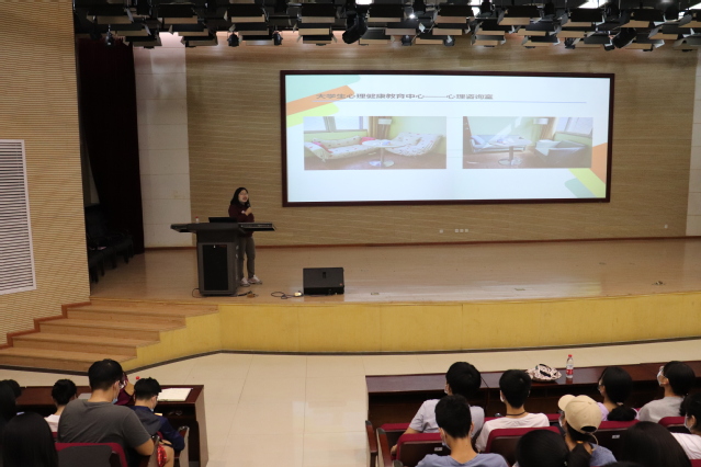 在现场,学校大学生心理健康中心主任郑婧首先介绍了中心设施、师资、服务和活动等,重点讲解了心理咨询预约方式、渠道等信息。紧接着,郑婧以“在变化的环境中调整自我”为主题讲述大学生的心理适应,阐述心理适应课的重要性,为新同学们展示了学生环境与角色的变化以强调生活与环境的适应、学习适应、人际关系适应和自我适应这四个方面的重要性。同时还介绍了多种培养适应能力的方法。
