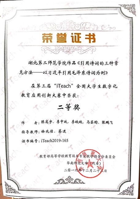 大三的下学期,她和班上几个同学组建了一个团队,一起参加了当年的“ITeach”全国大学生数字化教育运用创新大赛,并取得了全国二等奖的优秀成绩。由于一直在关注着本专业相关的比赛信息,当专业老师发布比赛通知时,她和伙伴们一拍即合,如火如荼地准备了起来。但准备的过程并不像想象中那么容易,因为不熟悉技术,备赛进度缓慢,不得不一遍遍“推翻重来”,最后,终于在截止日期的前一晚上交了作品。进入复赛后,在出发去江西师范大学进行最后的答辩的前一天晚上,她和团队所有成员全力以赴地准备,反复推敲着每一个字,不放过每一个细节。“比赛本身的意义已经不再是拿到多少名次了,坚持、相互鼓励、不断从中进步,这就是比赛的最大收获。”