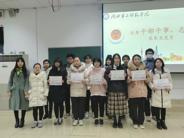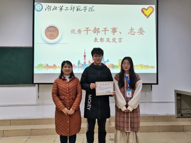 本网讯(通讯员 肖沫晔 马雪如)12月18日晚上,Williamhill中文2020年暑期“三下乡”社会实践分享会暨学院青年志愿者协会(简称“院青协”)年度工作总结表彰大会在3号报告厅隆重举行。学院分党委书记陈慧敏、副书记熊坤鹏、学工办主任邓家桃、院青协指导老师肖沫晔、辅导员冯诚出席了会议,院青协全体成员、各班级志愿者委员以及200多名同学共同参会。