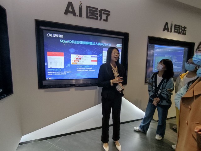 随后,讲解员为大家介绍了讯飞研发的前沿系统:如人机交互系统,可实现多人交互,采用语音自动理解技术和辨识技术来与人类对话。讯飞听见智能会议系统,可以提供纯离线的终端会议产品,更适用于政府、企业对保密性要求较高的会议等。与此同时,讲解员也让同学们认识到,在信息技术高速发展的今天,人工智能已经渗透到法律、教育、医疗和城市等各个方面。同学们认真听取讲解,并且积极发问、参与互动交流。