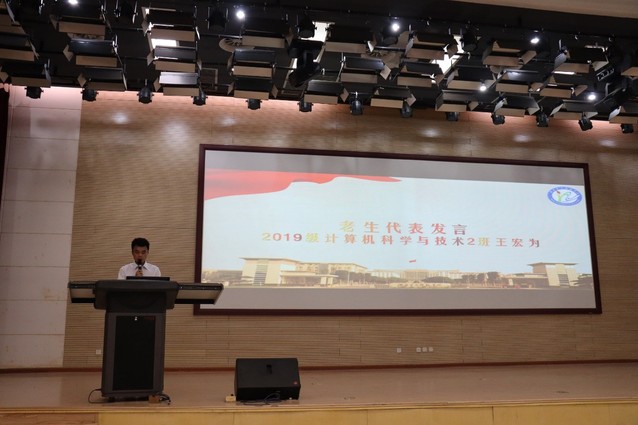 大会第八项,老生代表2019级计算机科学与技术2班王宏为发言。他对学弟学妹们的到来表示了热烈的欢迎,同时希望学弟学妹们能够踏实学习勤钻研,课堂之外多探索,大学社会多修行。