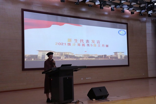 2021级计算机类5班王月丽作为新生代表发言。她表示,以梦为马,未来可期,站在人生的新起点,自己对于迈向大学生活新台阶充满了期待。她希望自己能与二师学子一起,以“只争朝夕,不负韶华”的热情去标记一个属于青年学子的新时代。