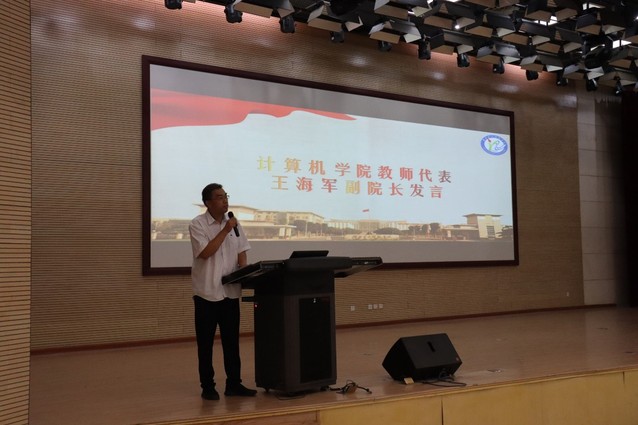 而后,教师代表王海军副院长发言。首先,他抒发了对互联网+发展的感慨,并对互联网+获奖团队成果表示肯定。接着用以往学生的反面案例来告诫新生,希望新生在大学生活中坚持努力学习、提前规划未来、努力做到“自控”。最后,他对ACM竞赛进行了宣传,鼓励同学们参与其中。