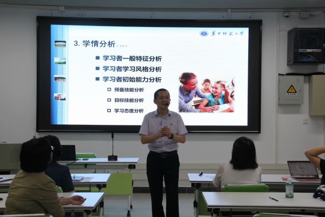 吴军其教授从教学设计、课堂导入、呈现方式、活动组织、学习评价和课堂小结七个方面逐一剖析课堂教学设计的要点,从如何撰写教学设计表,到课堂导入的8种方式,分析学习评价的三个阶段等,把一堂课程的设计解剖地十分细致。讲座现场,吴教授声音洪亮、精神状态饱满,也为老师们展示了一堂激情满满的课程范例。