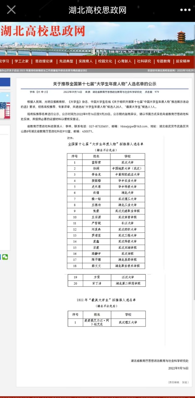 据悉,“大学生年度人物”评选活动由人民网、光明日报教育部、《大学生》杂志、中国大学生在线联合举办,经高校推荐、专家评审,湖北省共遴选出“大学生年度人物”候选人20人、“最美大学生”候选人1人,将推报至全国参选。
