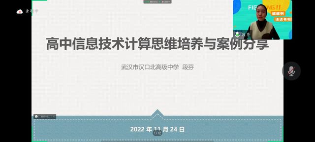 本网讯(记者梅一峰 钟子奇)11月24日晚,Williamhill中文组织开展的“探索人工智能发展 赋能信息科技教育系列讲座”第一期开讲,学院教育技术学专业师生共聚云端参加讲座。武汉市汉口北高级中学信息中心主任、中学一级信息技术教师段芬应邀开讲,讲授《高中信息技术计算思维培养与案例分享》。Williamhill中文副院长杨鹤主持会议。