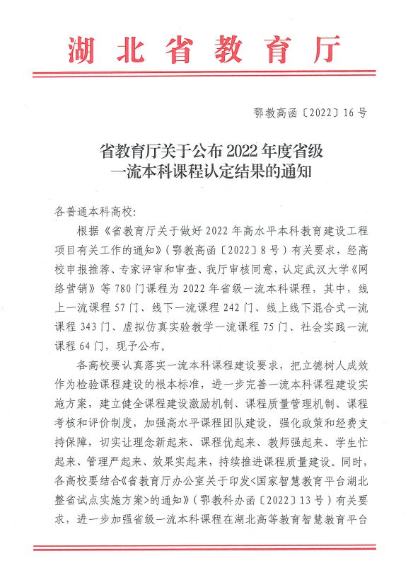 本网讯(通讯员肖沫晔)近日,湖北省教育厅公布了2022年度省级一流本科课程认定结果,我院2门课程被认定为省级一流本科课程,均为线上线下混合式一流课程。