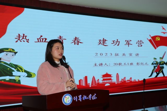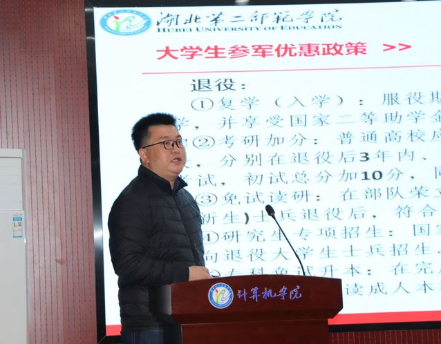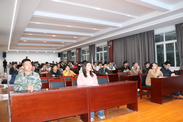 活动伊始,人民武装部国防教育科主任王骏简单介绍了我国的兵种、部队组成、人员职称简介等方面,并重点向同学们介绍了应征入伍基本条件、参军入伍的福利待遇及相关优待政策等。随后,学院退役士兵代表郑家龙、彭纪元、苏国平三位同学和与会师生分享交流了自己参军入伍的心路历程及军营生活。最后,人民武装部副部长刘兴作征兵动员讲话。刘兴结合退伍军人学生的例子,鼓励更多的有志青年能够早日参军队伍,在火热的军营中激扬青春梦想、点亮迷彩人生!