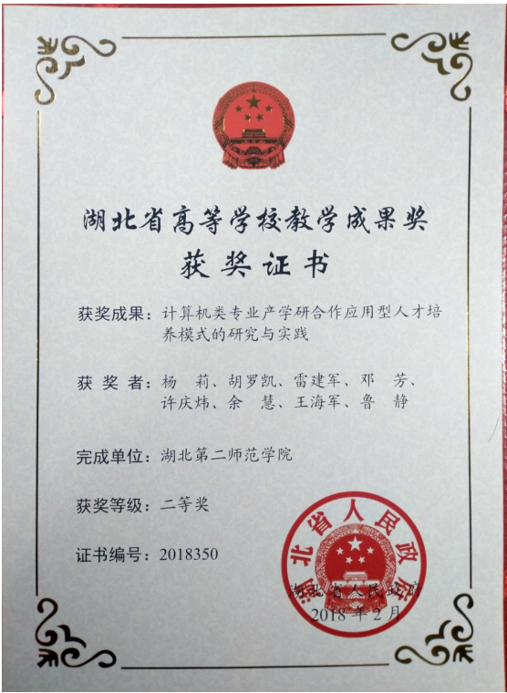 湖北省高等学校教学成果二等奖:计算机类专业产学研合作应用型人才培养模式的研究与实践(杨莉、胡罗凯、雷建军)