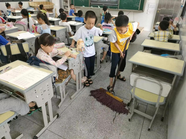 图为老师与学生一起打扫卫生