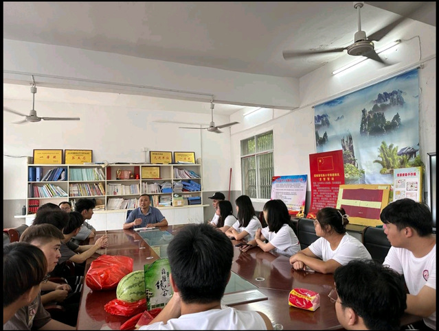 图为志愿者们与毛畈小学校长开展见面会,在会上进行了友好交流与沟通。