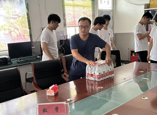 图为学校老师为志愿者们分发矿泉水。