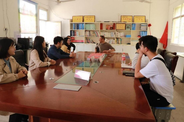 图为支教队员与校长交流讨论工作内容中国青年网通讯员周瑶摄