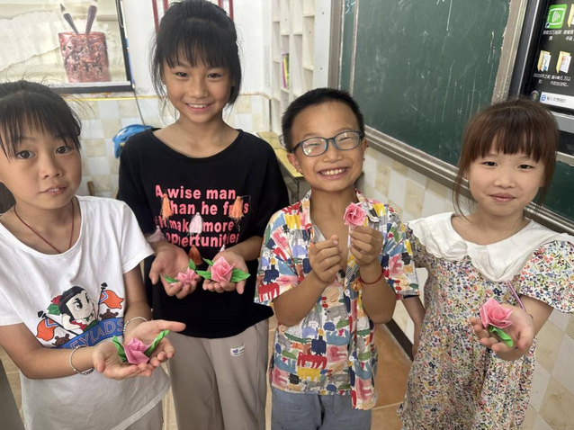 图为小朋友们激动的展示手工作品