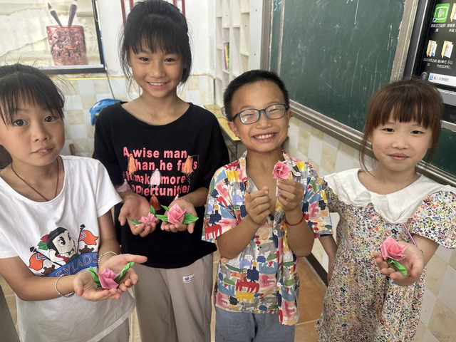 图为小朋友们把手工课折的花送给支教老师。中国青年网通讯员周瑶摄