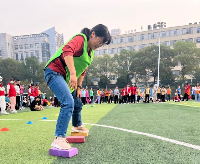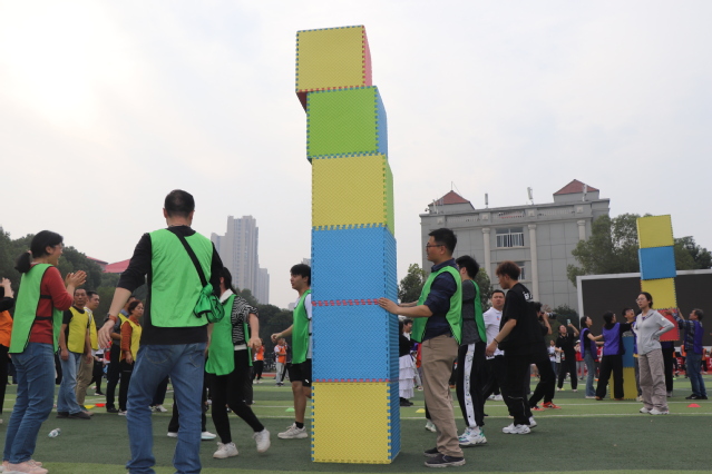 “步步高升”项目中,团队在院工会主席王敏的带领下,充分发挥集体智慧,迅速将泡沫垫砖一个个堆叠起来,在规定时间内取得了令人瞩目的成绩。大家互相切磋、互相鼓励、互相喝彩,整个运动会气氛热烈而欢快,参赛选手们充分展现了他们的高度的体育素养和团队精神。