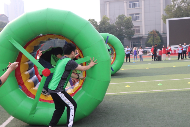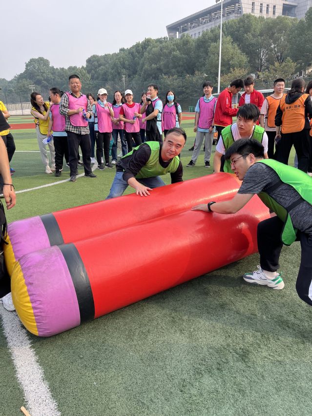 “乾坤挪移”项目中,老师们展示了他们出色的协同能力,凭借独特的翻滚技巧,顺利将充气大铅笔翻滚到了终点,为学院赢得了可喜的成绩。