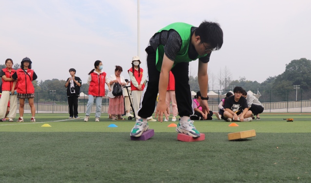 “摸石过河”项目中,冯诚和蔡进老师充分发挥团队配合和平衡能力,在泡沫垫砖上稳步穿行,成功地将整个队伍带领到了终点,展现了他们的稳定性和敏捷性。