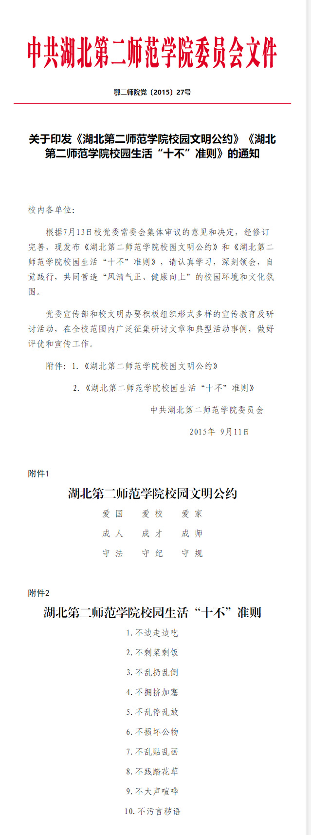 关于印发《william威廉英国校园文明公约》《湖北 第二师范学院校园生活“十不”准则》的通知