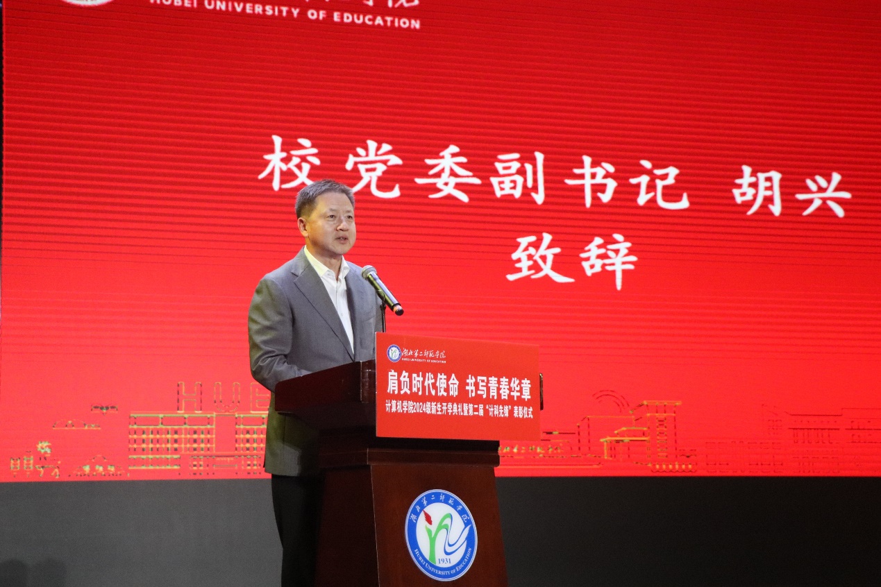本网讯(通讯员 廖航)2024年11月14日下午14:00,计算机院在学校大礼堂隆重举行了2024级新生开学典礼暨第二届“计科先锋”表彰仪式,校党委副书记胡兴出席本次活动。