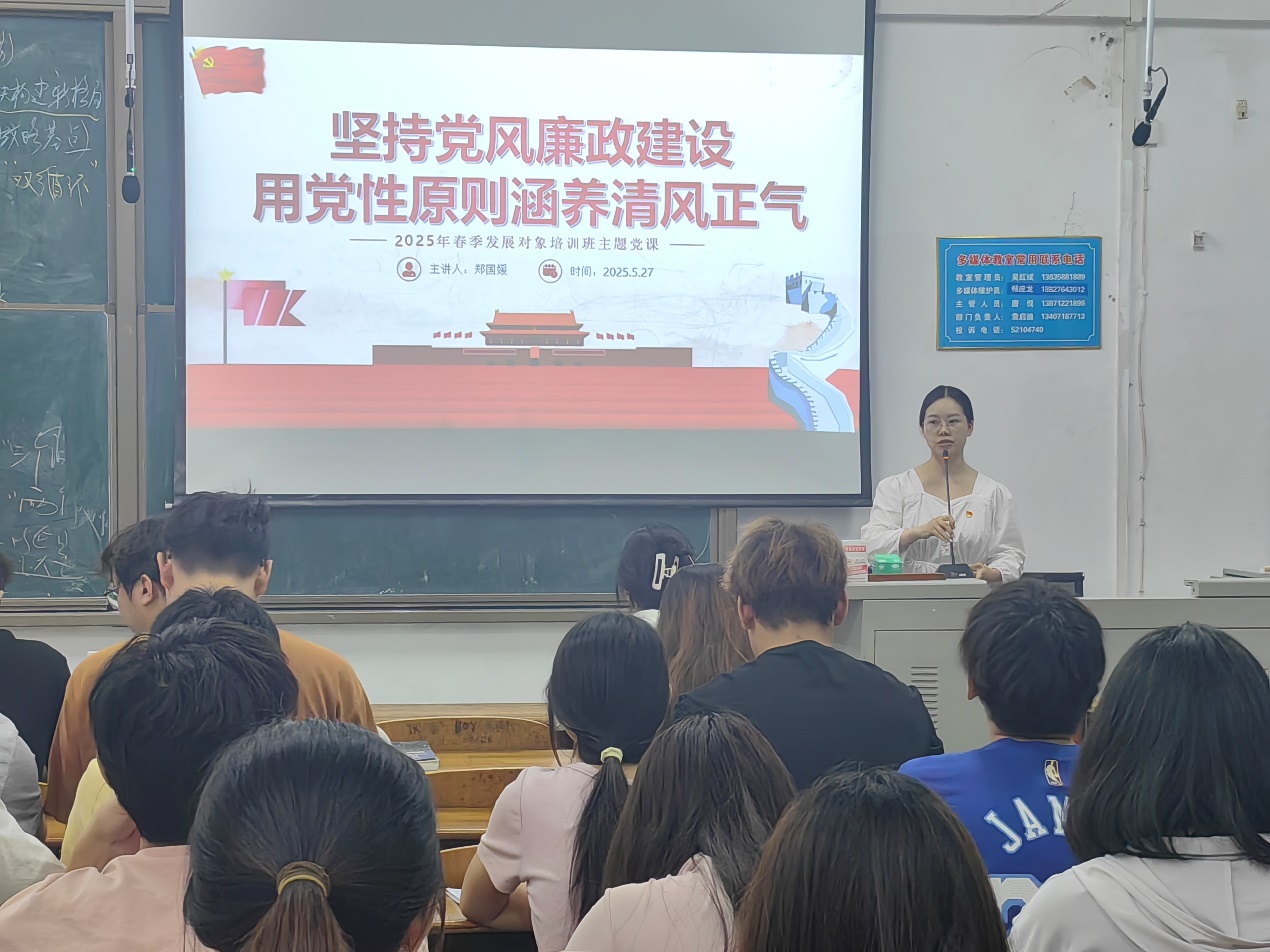 本网讯(通讯员 杨雪)5月27日,Williamhill中文第 108期党的发展对象培训班"坚守党风廉政建设 用党性原则涵养清风正气"主题党课在 10301教室举行。Williamhill中文学生第二党支部组织委员郑国媛应邀作专题辅导报告,全体学员参与学习。
