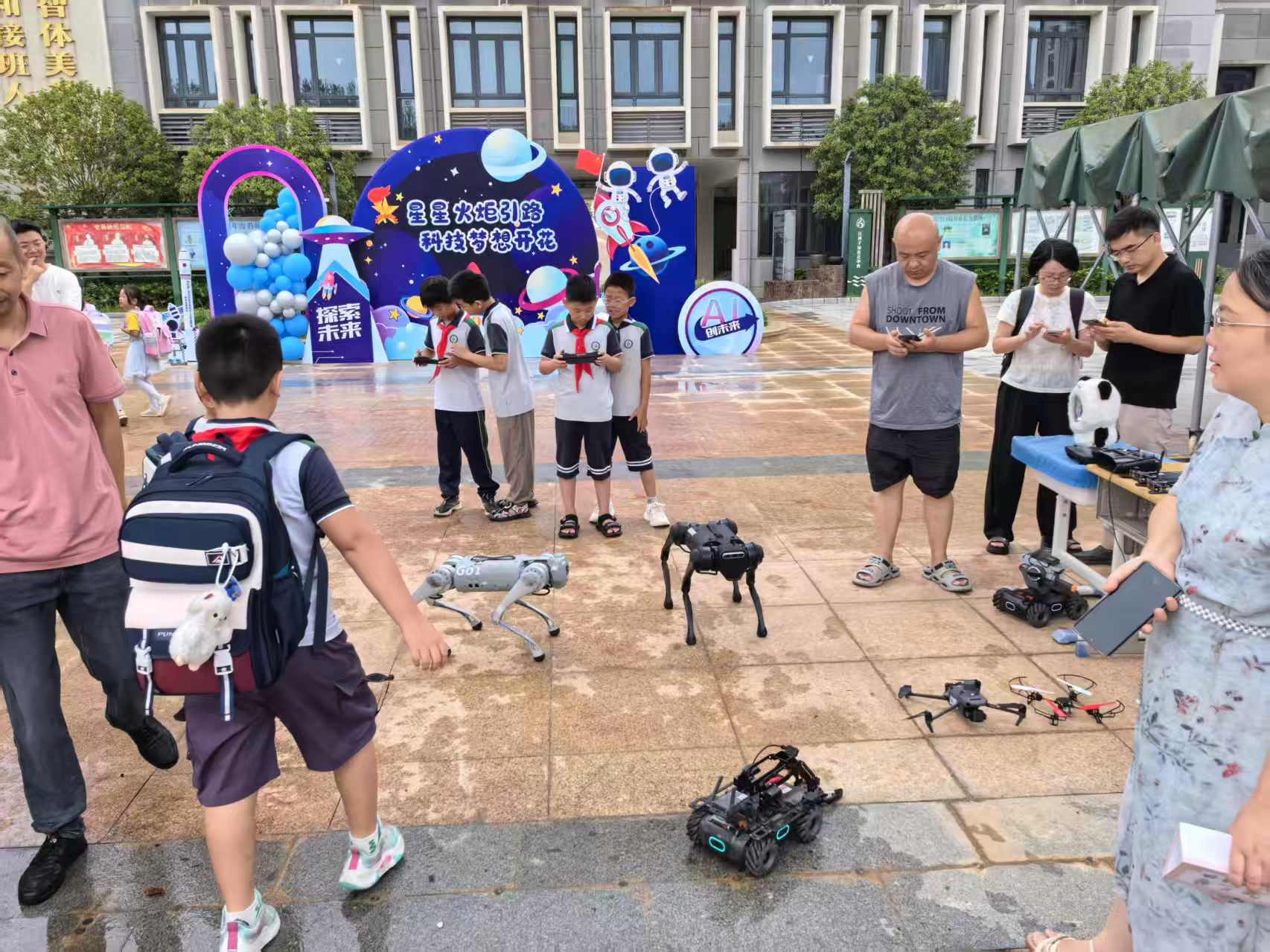 活动现场,机器狗灵活地翻滚、跳跃,引发现场阵阵惊呼;无人机在空中精准悬停、特技飞行,描绘出科技的魅力弧线;智能车敏捷避障,展示着自动驾驶的奥秘;紧张刺激的对战机器人则让同学们在欢呼声中感受到工程与编程的乐趣。学院的大学生和老师们耐心讲解原理,并指导孩子们进行简单互动操作,让抽象的AI技术变得可触可感。