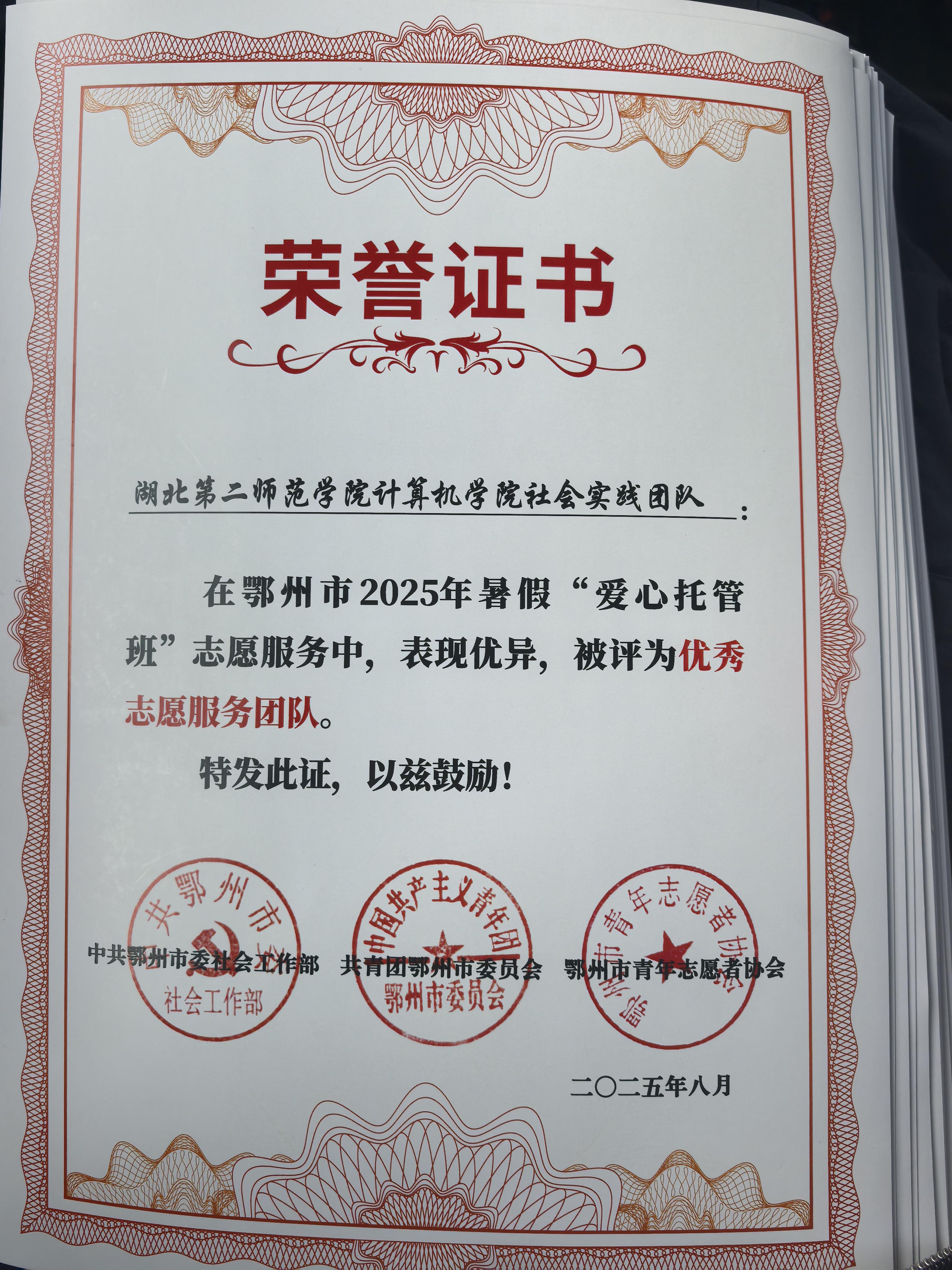 鄂州团委也为志愿者们颁发志愿服务证书,并授予该团队“优秀志愿服务团队”称号。此外,“朝夕守望”志愿服务团队与蒲团乡团委就后续共建志愿服务项目展开深入交流。此次活动标志着暑期“三下乡”支教活动的圆满收官,也开启了校地共建志愿服务的新篇章。
