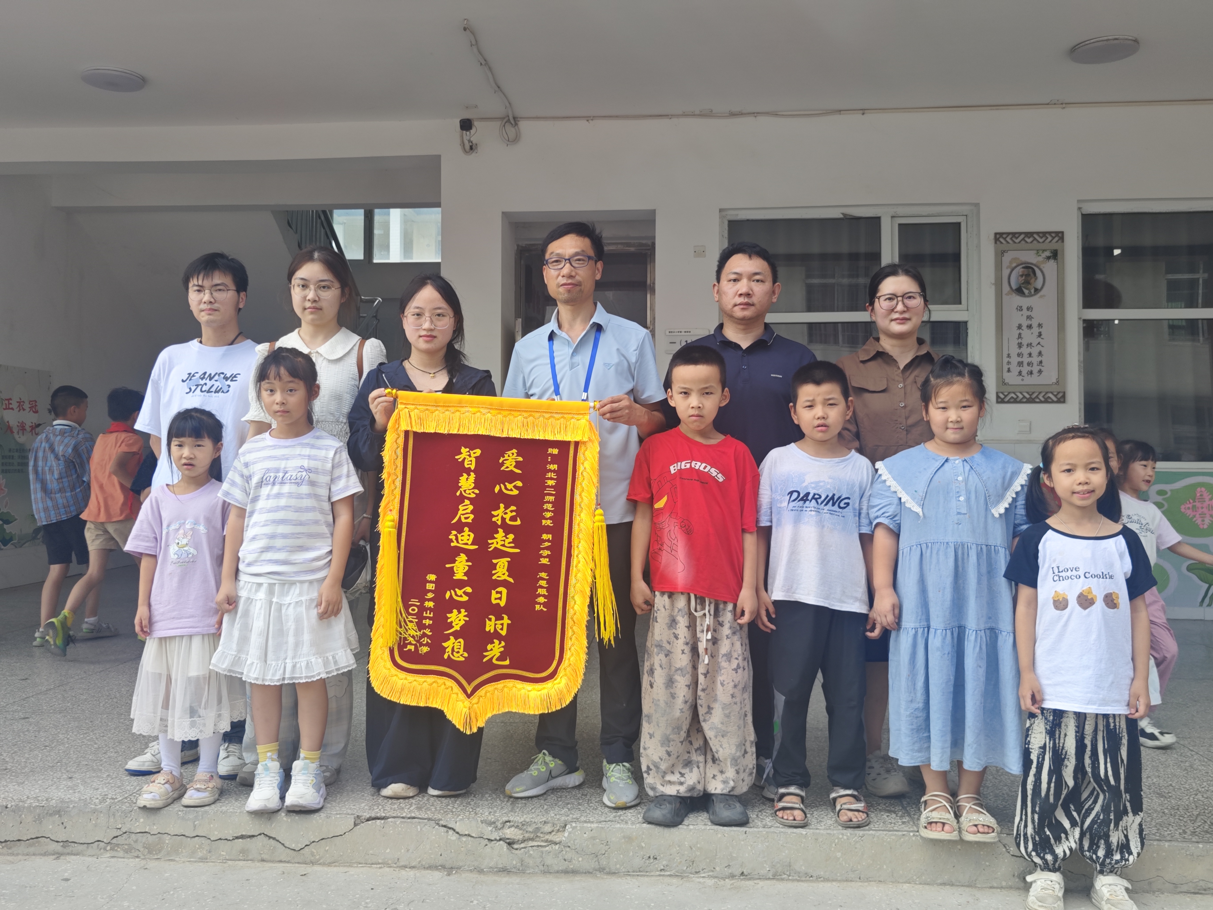 9月11日,鄂州市华容区蒲团乡横山中心小学举行了一场特别的仪式。横山中心小学向william威廉英国“朝夕守望志愿服务队”赠送了写有“爱心托起夏日时光,智慧启迪童心梦想”的锦旗,以此表达对志愿者们暑期支教工作的诚挚谢意。
