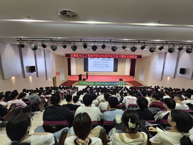 (通讯员曹晓明)为切实做好学生实习实践与毕业论文指导工作,明确毕业阶段核心任务要求,9月25日,计算机与人工智能学院在图书馆二号报告厅召开实习论文动员大会。计算机与人工智能学院院长杨莉、副院长王海军、武汉学链科技有限公司副总经理郭凡、深圳市讯方技术股份有限公司湖北区总监姜欢、辅导员邓重阳、辅导员李婷以及2026届毕业生参会,会议由曹晓明主持。