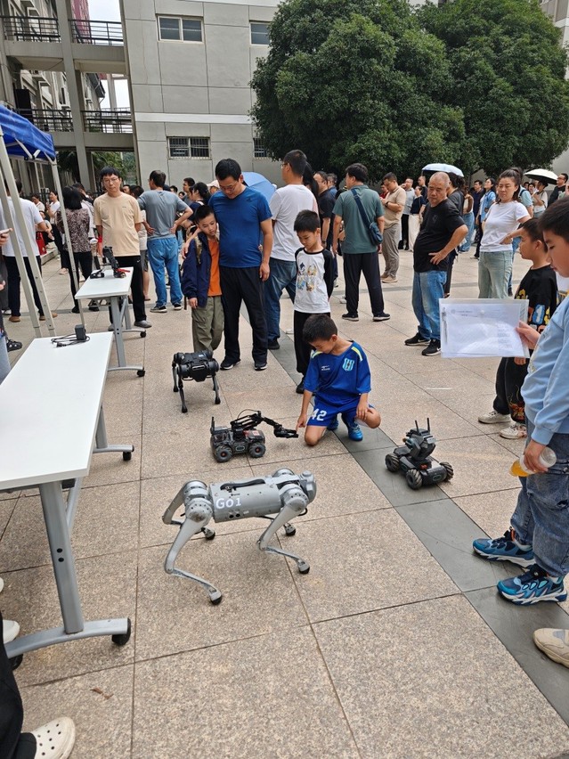 活动现场,科技元素随处可见,成为点燃孩子们好奇心的“火种”。机器狗迈着灵活的步伐完成跳跃、转圈等动作,引得孩子们阵阵惊呼;智能小车沿着预设路线精准行驶,展现出自动化技术的神奇;对战机器人在指定区域内“切磋较量”,灵活的操控与反应让现场氛围持续升温。孩子们或围在设备旁仔细观察,或在志愿者指导下尝试操作,一双双求知的眼睛里满是对科技世界的向往,亲手触摸科技的体验,让抽象的人工智能知识变得生动可感。