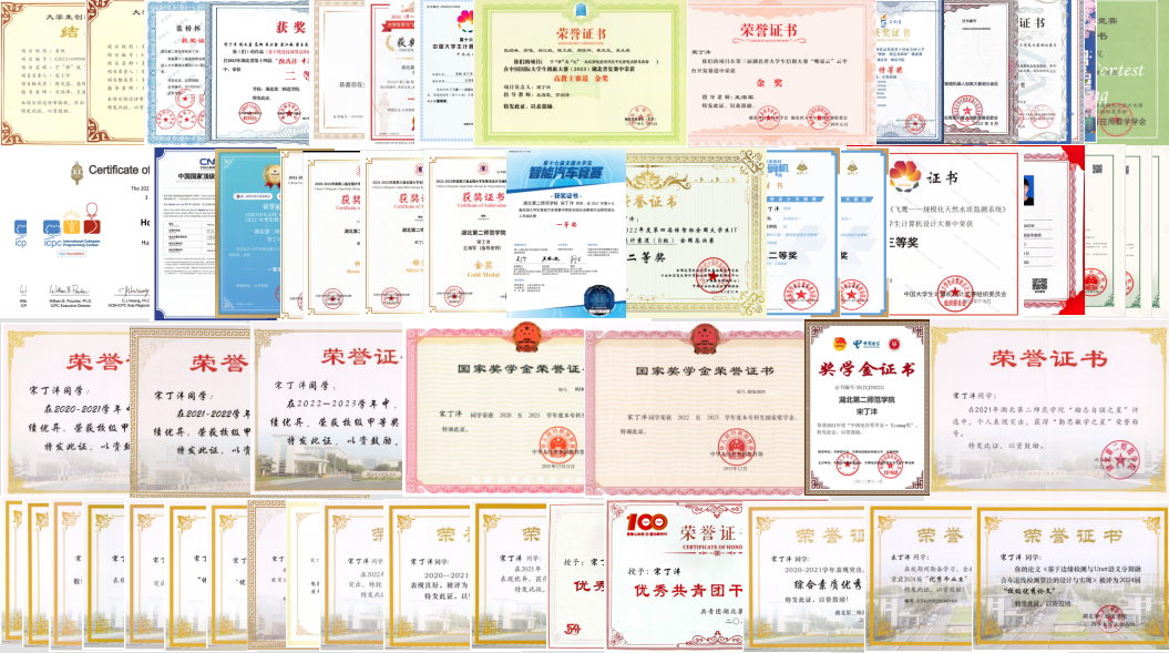 宋丁沣本科期间连续三年专业第一,获国家奖学金、中国大学生自强之星奖学金、中国电信奖学金等10余项奖学金,5次在竞赛上创全校历史最高记录,与团队获得学校历史首个中国国际大学生创新大赛全国金奖、全国大学生智能汽车竞赛全国一等奖等国家级荣誉19项,省级荣誉20项。已申请5项发明、7项实用新型、30项软著。曾任2020级计科1班学习委员、2022-2023年学院ACM协会副会长、2024年学院嵌入式AI团队首任队长。