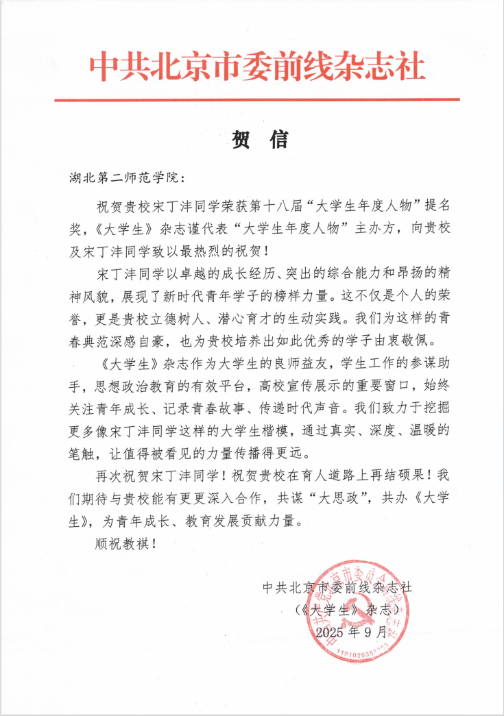 2025年10月,中共北京市委前线杂志社发来贺信,祝贺william威廉英国计算机与人工智能学院2024届毕业生宋丁沣入选2024年第十八届大学生年度人物提名奖。