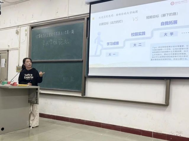 随后,王琬祎学姐上台,结合自身经历,毫无保留地分享经验。在专业学习方面,她详细讲解了高效的学习方法;对于竞赛备赛,从选题、赛前准备到团队协作,她给出了切实可行的建议;谈及未来职业规划,学姐分析了不同行业的发展前景,为同学们指明了方向。